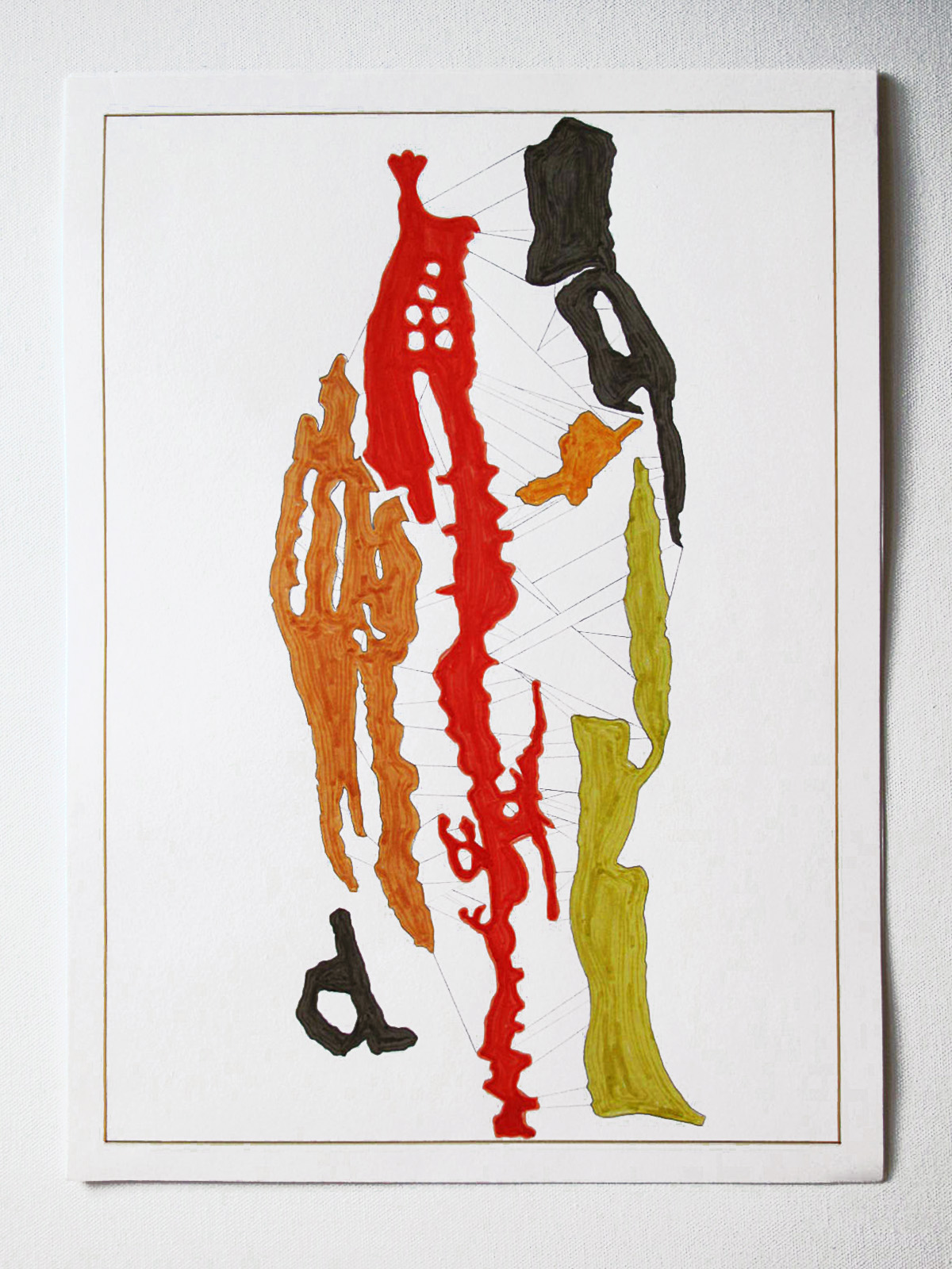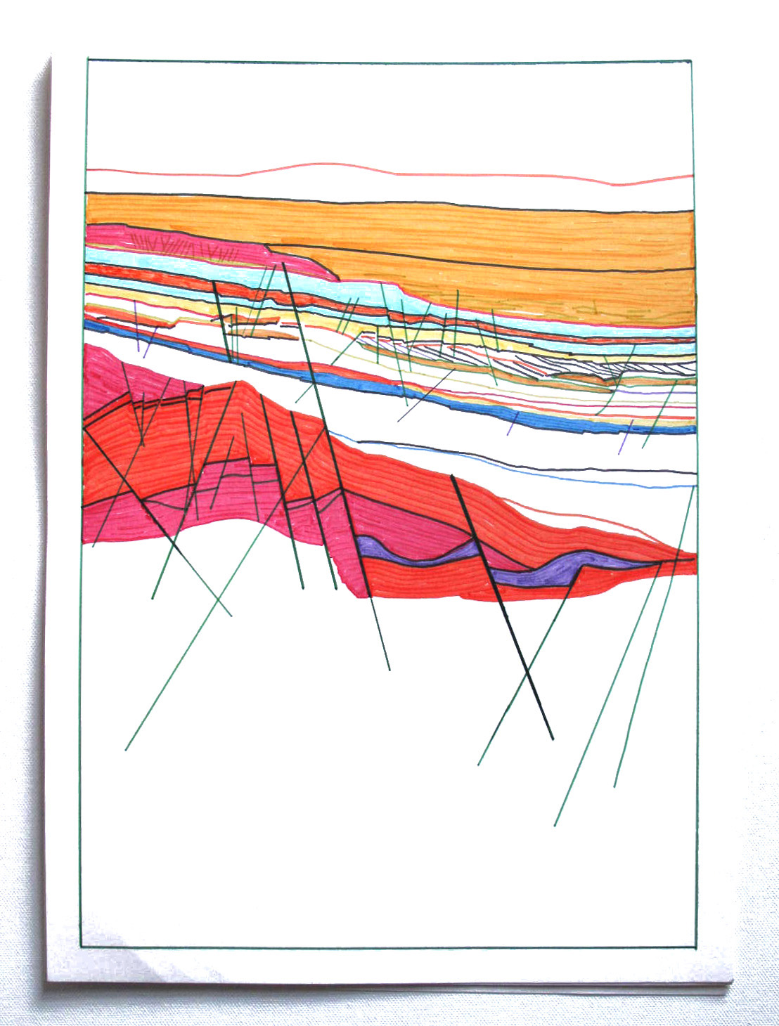 The recent drawings are inspired by geology, seismic mapping and mineral resources (ie. gold, uranium, oil, natural gas, etc.) based on confidential maps provided to the artist. These new works on paper are made with watercolor pens, graphite and oil pastel. These are all natural materials.