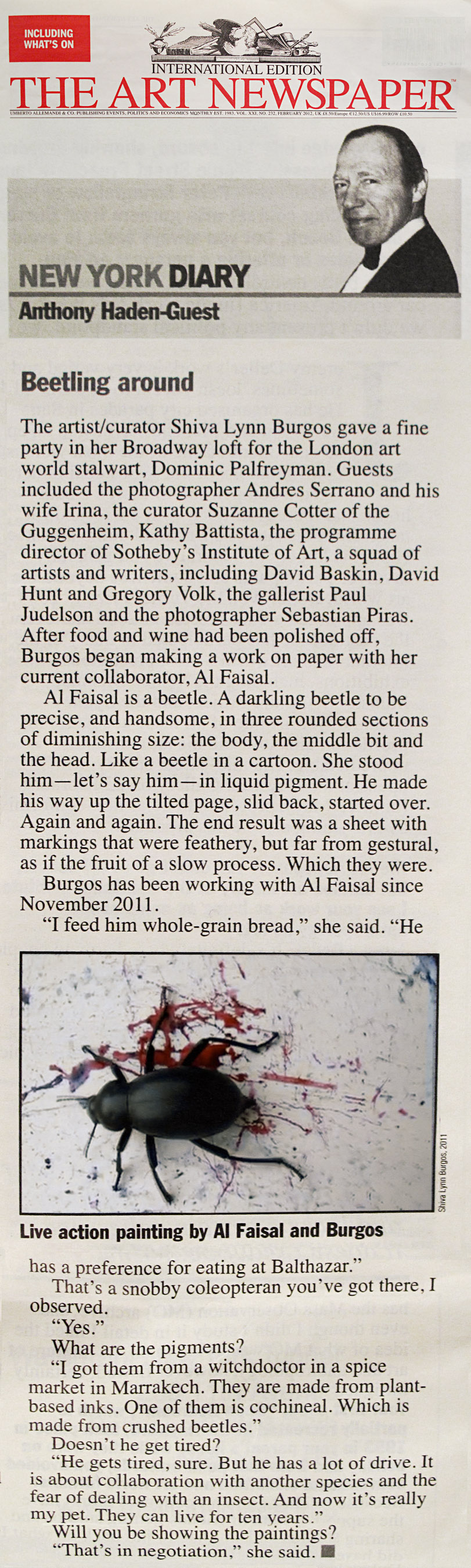 The Al-Faisal Series, (2011/2012), is a succession of watercolor paintings on A2 size heavy Arches hot-press watercolour paper made in collaboration with a desert darkling beetle (Blaps gigas). The performance of creating these action paintings is a partnership and I have occasionally involved other artists to collaborate in the process.
